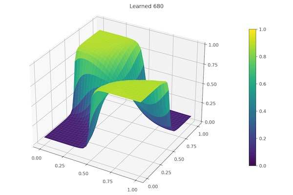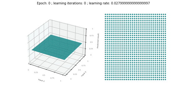 The three inputs I decided to use (after a lot of trial and error) are the X and Y coordinate of a point (between X = 0, X = 1, Y = 0 and Y = 1) and as the third input the multiplication of both X and Y. Apparently it gives the network more information, and it ends up converging much more quickly with this third input.